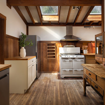 The main level of the house features a generous living room which flows to the most charming kitchen. With a vintage O’Keefe and Merritt stove, butcher block counter tops, hardwood floors and skylights that flood the space with natural light, this is the heart of the home. There are two bedrooms on this level, both with vintage, paned windows that capture the views of nature that surround the property. The full bathroom on this level features a vaulted wood and beamed ceiling with a gleaming skylight. You feel like you’re truly in a retreat-type space.